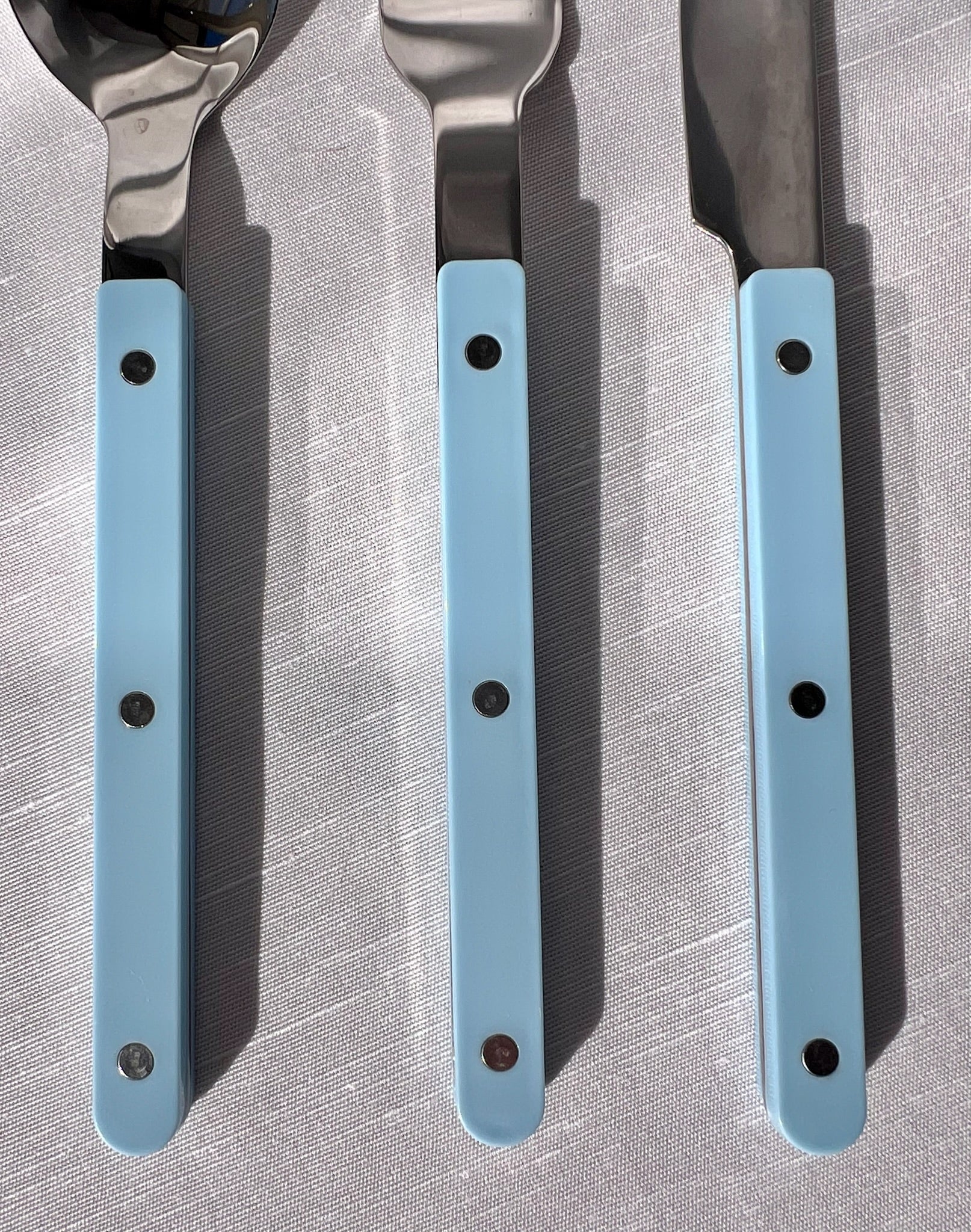 This cutlery comprises a 3-piece set which includes a knife, fork, and dessert spoon, all featuring clean stainless steel tops and soft baby blue handles. Designed to elevate any table or dish, they’re just the right mix of playful and polished. Pair them with bold plates or let them shine on their own, either way, they’re guaranteed to make every bite feel a little more special.
